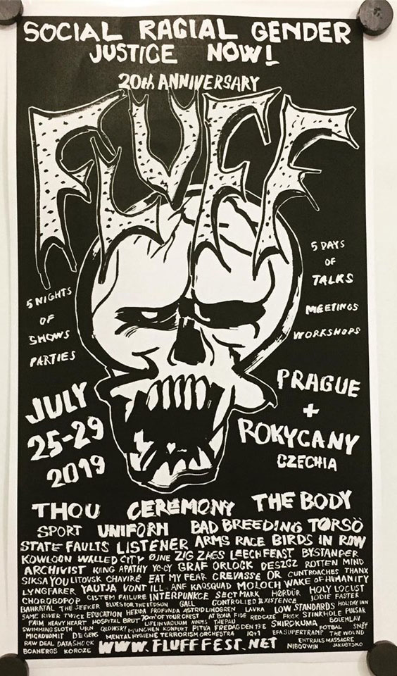 We also organize Fluff Fest, a multi-genre festival linking music and political activism. The festival is strictly self-funded independent event, free from sponsorship or government funding. Fluff Fest takes place every year the last weekend of July at the Rokycany airfield.